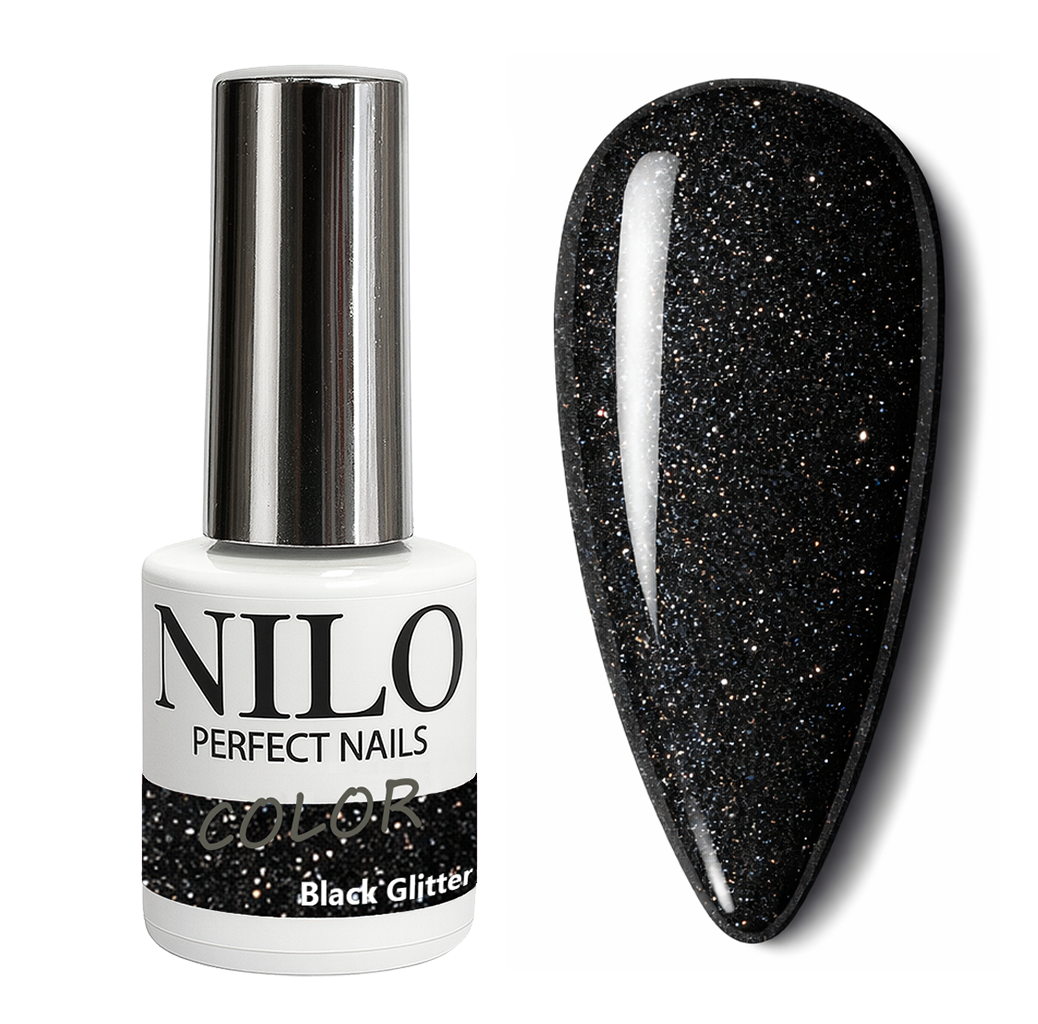 Black Glitter no. 102 to głęboka, klasyczna czerń wzbogacona drobnymi, srebrnymi drobinkami, które subtelnie odbijają światło. Elegancki efekt glitter nadaje stylizacji wyrazistości, zachowując jednocześnie luksusowy i nowoczesny charakter. Kolor idealnie sprawdzi się zarówno w wieczorowych stylizacjach, jak i jako akcent w połączeniu z innymi odcieniami. Zapewnia równomierne krycie oraz intensywny połysk już po dwóch cienkich warstwach.